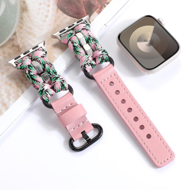 For Apple Watch SE 44mm Paracord Genuine Leather Watch Band(Pink Camo)