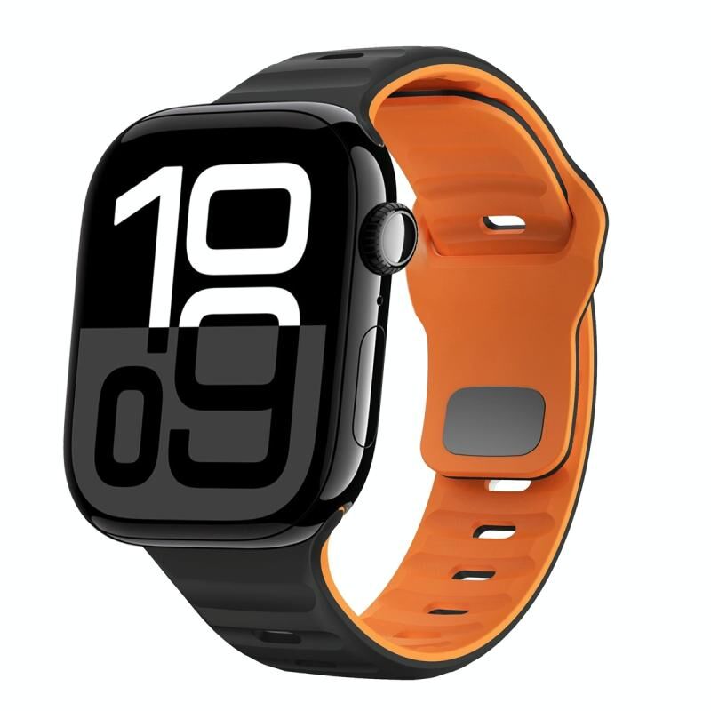 Για Apple Watch Series 10 46mm Λουρί Σιλικόνης με Αγκράφα Αντίστροφης Καρφίτσας Υφής Κύματος (Μαύρο Πορτοκαλί)