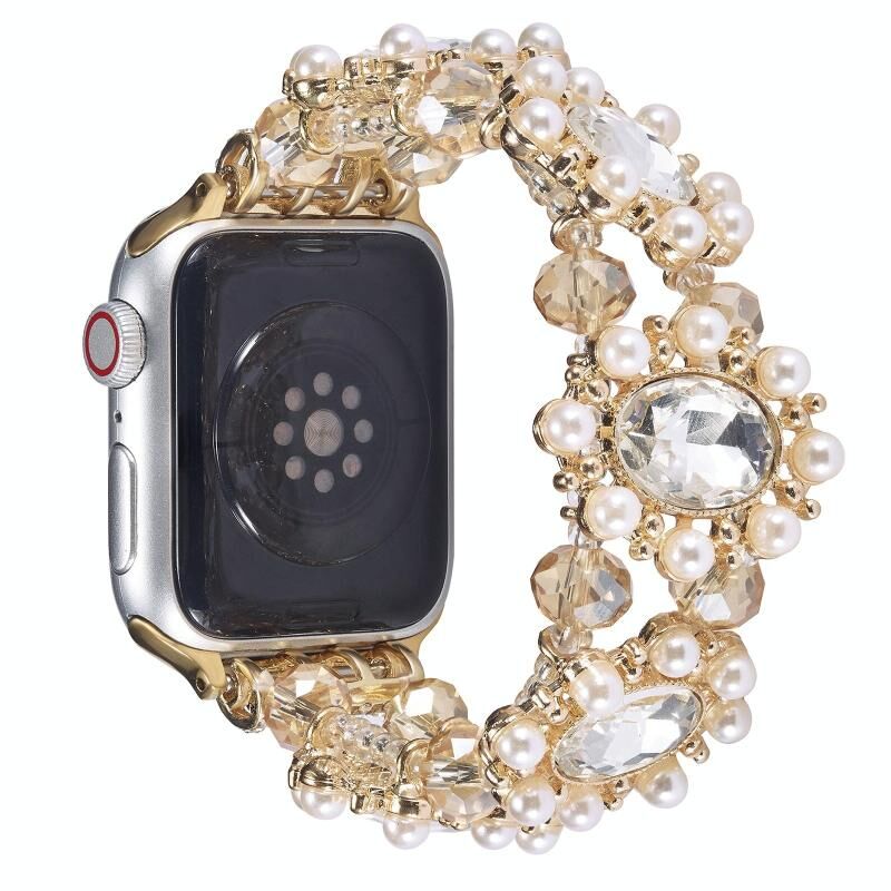 For Apple Watch Series 3 42mm Beaded Pearl Gemstone Bracelet Watch Band(Light Gold)