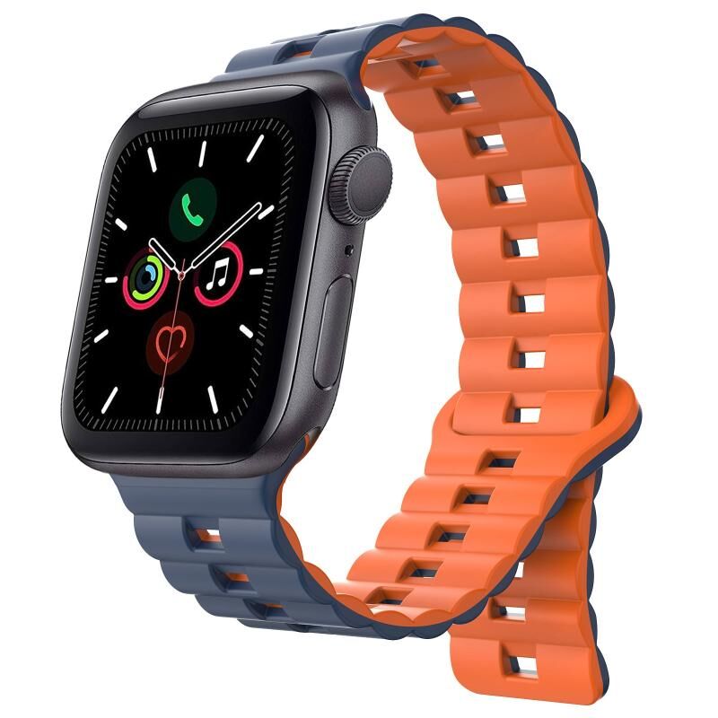 Για Apple Watch Series 5 44mm, Λουρί Σιλικόνης με Μαγνητικό Κούμπωμα Αντίστροφης Πόρπης, Δύο Χρωμάτων (Μπλε της νύχτας + Πορτοκαλί)