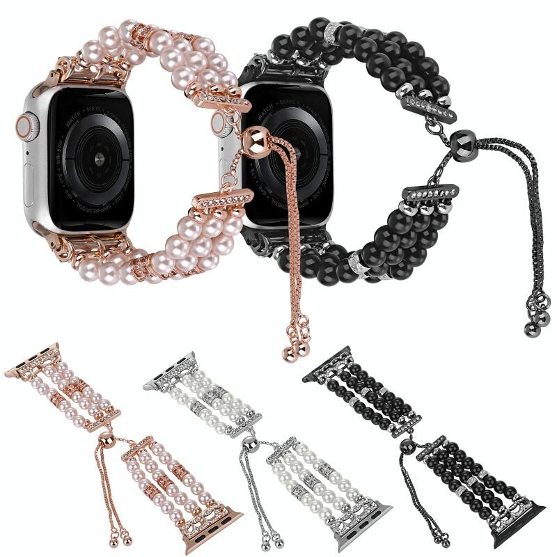 For Apple Watch Series 6 40mm Beaded Pearl Retractable Chain Watch Band(Black)