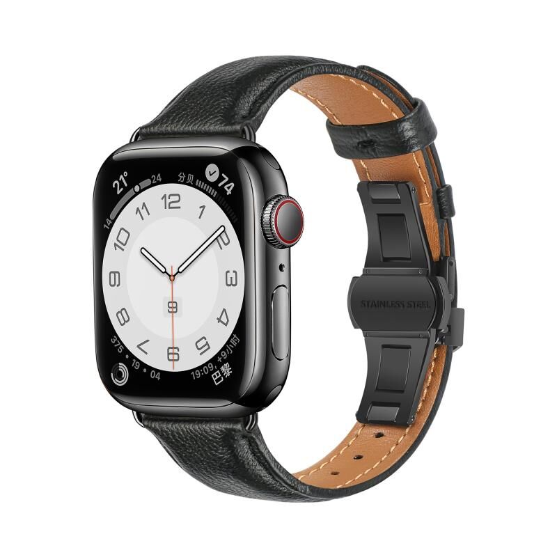 Για Apple Watch Series 7 41mm Λουρί Ρολογιού από Απλό Δέρμα με Αγκράφα Πεταλούδας (Μαύρο + Μαύρο)