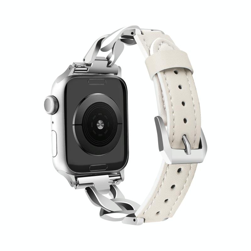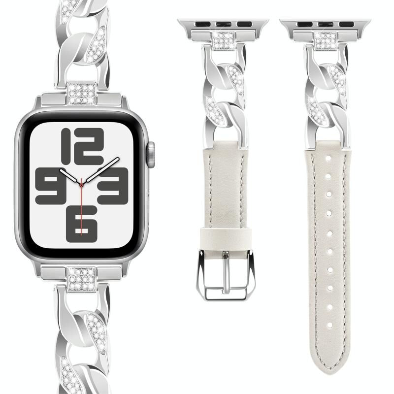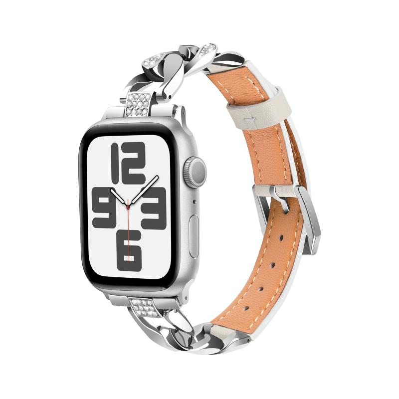 Για Apple Watch Series 7 41mm Λουράκι Δερμάτινο με Αλυσίδα και Στρας (Μπεζ)