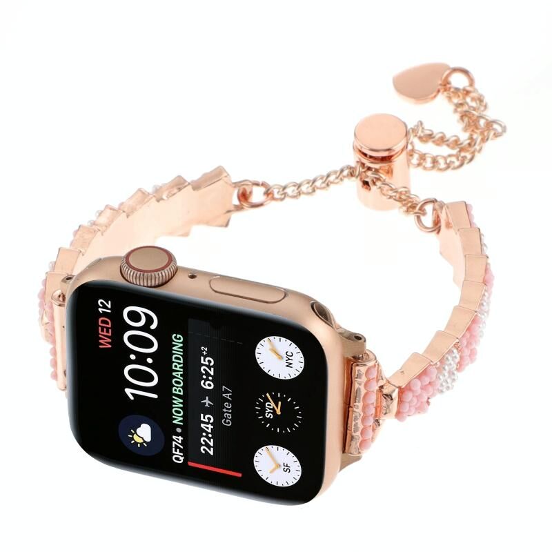 For Apple Watch Series 7 41mm Shell Beads Chain Bracelet Metal Watch Band(Pink White Rose Gold)