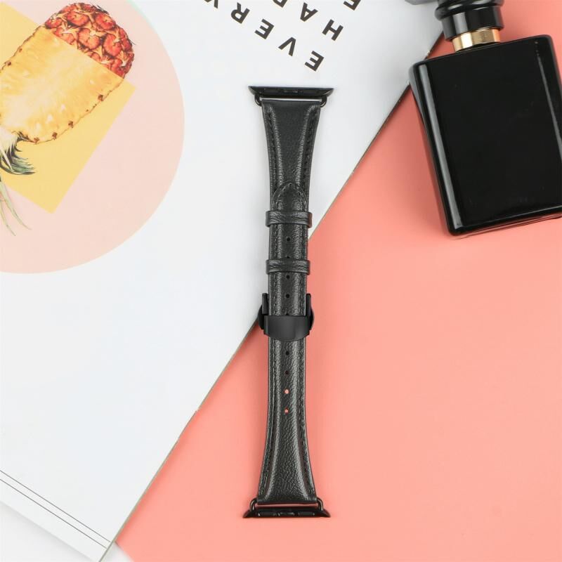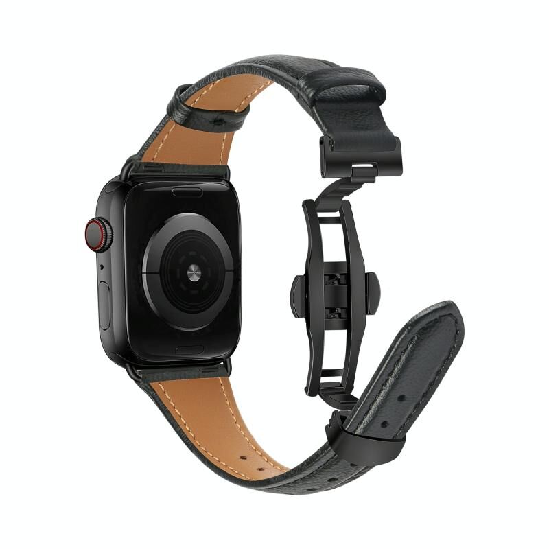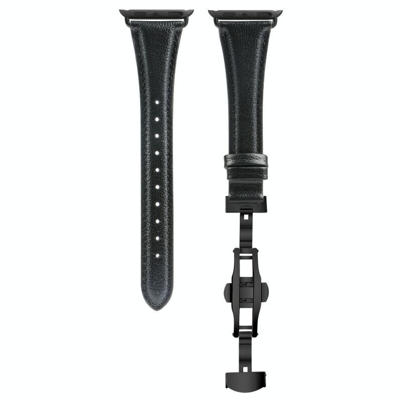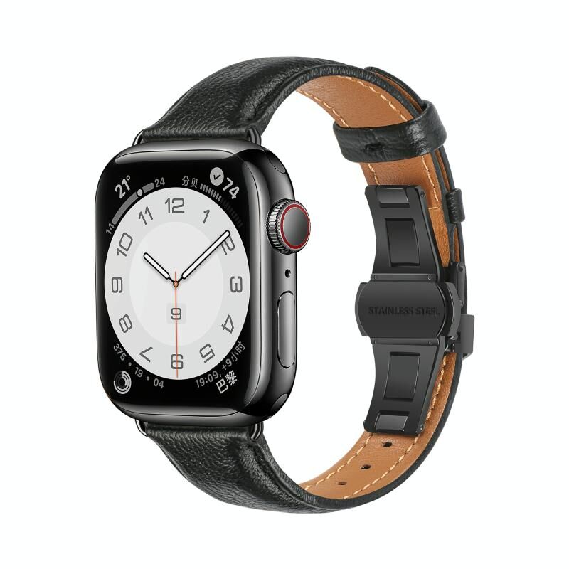 Για Apple Watch Series 7 45mm Λουρί Ρολογιού από Απλό Δέρμα με Αγκράφα Πεταλούδας (Μαύρο + Μαύρο)