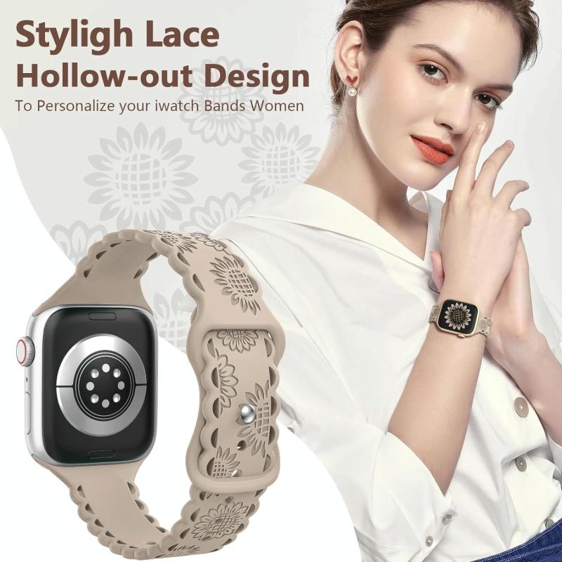 Για Apple Watch Series 8 45mm Λουρί Σιλικόνης με Δαντέλα και Χαραγμένο Ηλιάνθρωπο (Γαλακτώδες Τσάι)