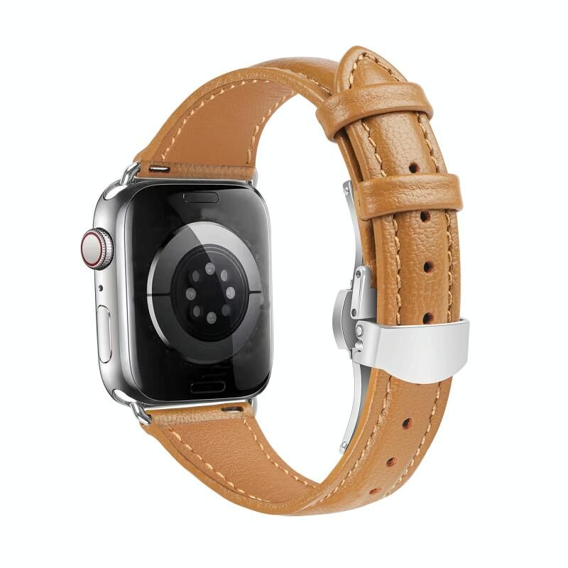For Apple Watch Series 8 45mm Plain Leather Butterfly Buckle Watch Band(Brown+Silver)
