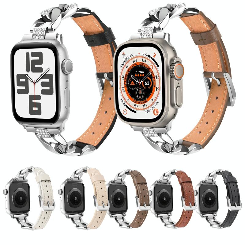 Για Apple Watch Series 8 45mm Λουράκι Δερμάτινο με Αλυσίδα και Στρας (Μπεζ)