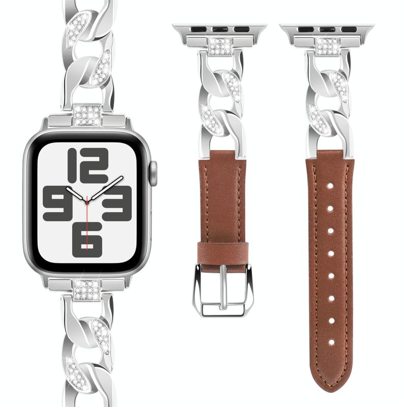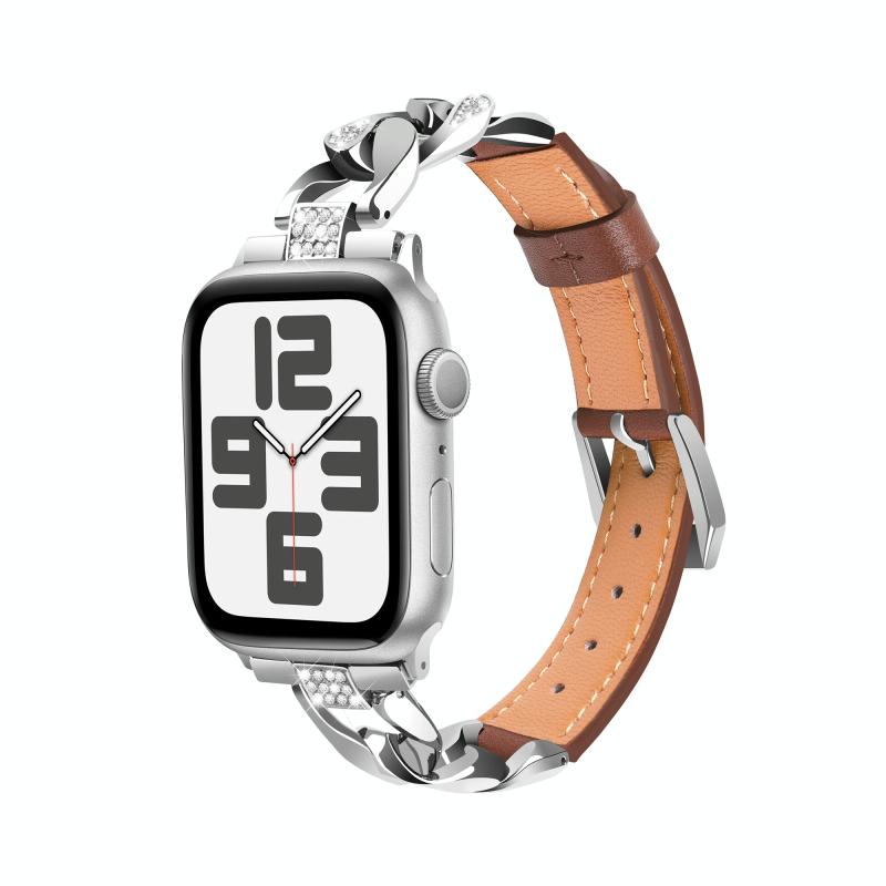 Για Apple Watch Series 9 41mm Λουράκι Δερμάτινο με Αλυσίδα και Στρας (Καφέ)