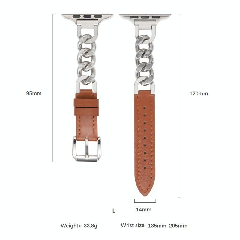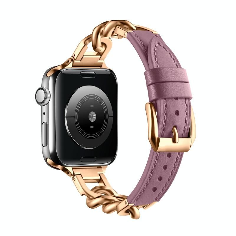 Για Apple Watch Series 9 45mm, Αυθεντικό Δερμάτινο Λουρί με Αλυσίδα, Μέγεθος: L (Ροζέ χρυσό απαλό μωβ)