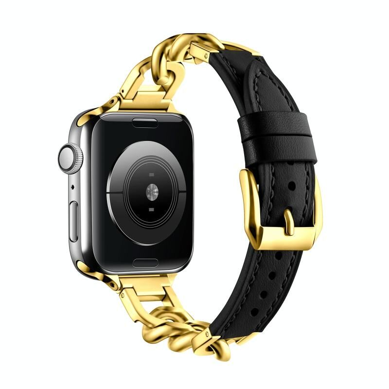 Για Apple Watch Series 9 45mm, Αυθεντικό Δερμάτινο Λουρί Αλυσίδα, Μέγεθος: S (Χρυσό Μαύρο)