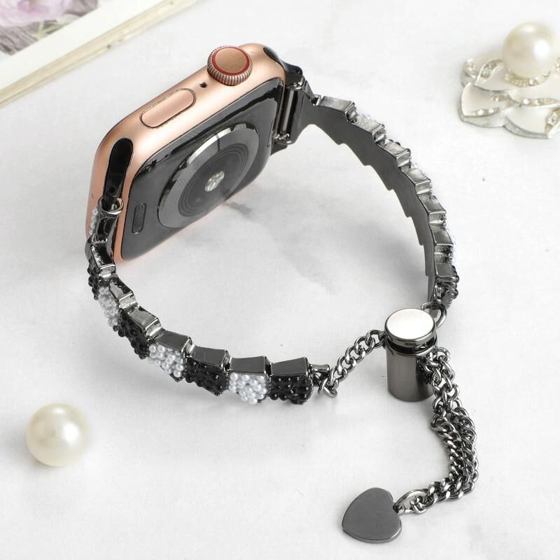Για Apple Watch Series 9 45mm Κέλυφος Μαργαριταρένιας Αλυσίδας Βραχιόλι Μεταλλικό Λουράκι Ρολογιού (Μαύρο Λευκό)