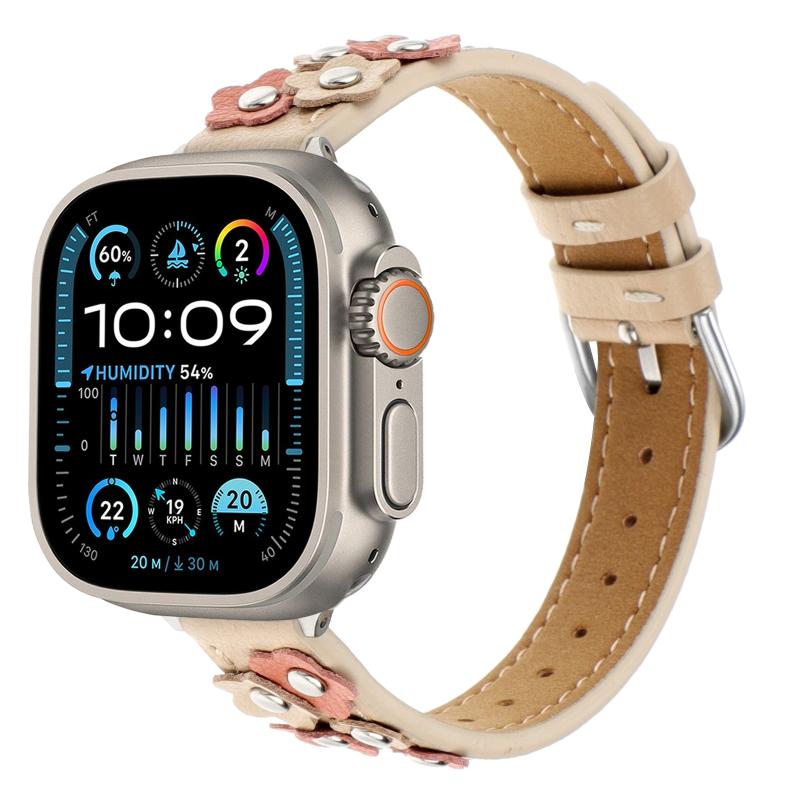 For Apple Watch Ultra 2 49mm Stitched Flower Leather Watch Band(Khaki)