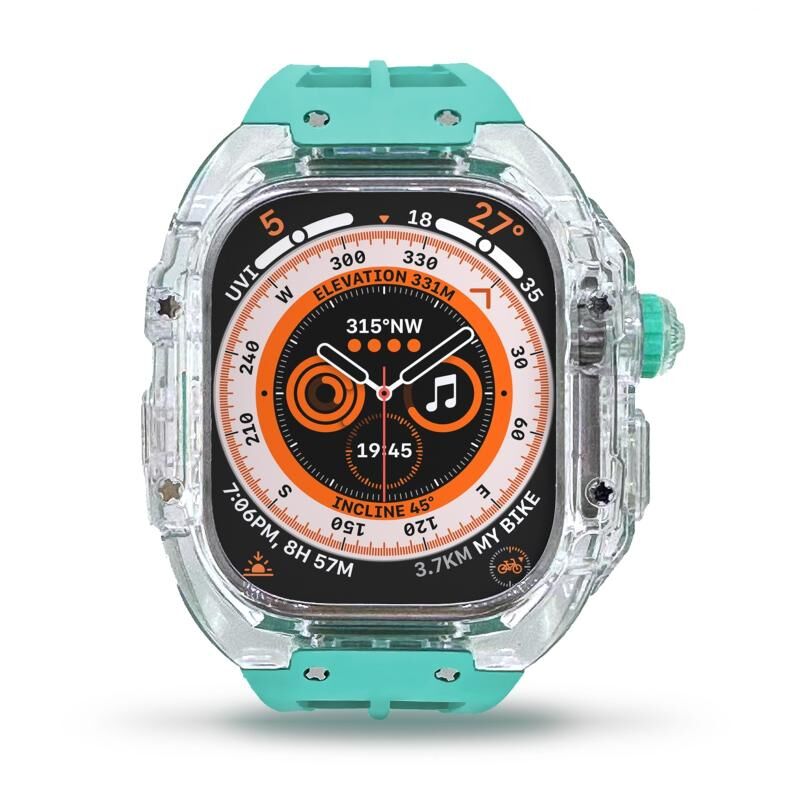 Θήκη προστασίας για Apple Watch Ultra 49mm από φθοριούχο καουτσούκ, διαφανής, με μπλε λουράκι ρολογιού.