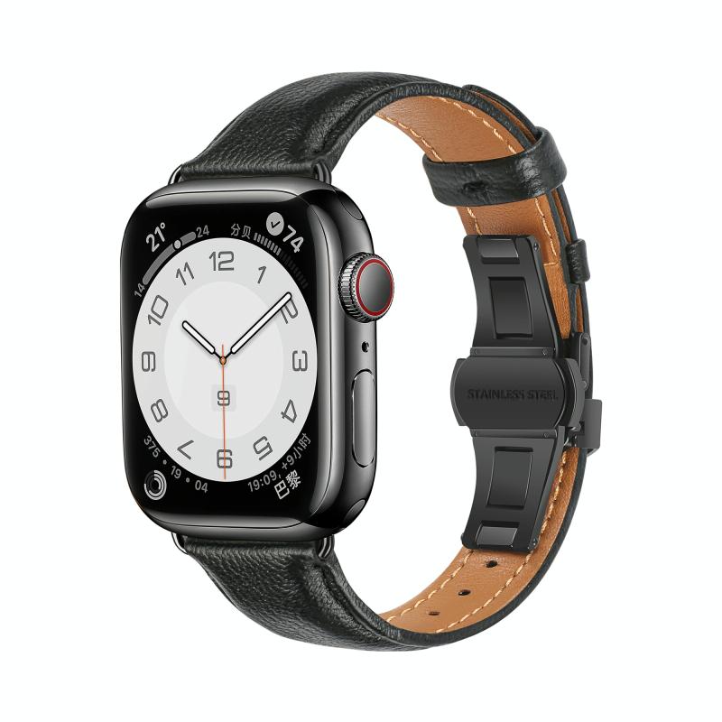 For Apple Watch Ultra 49mm Plain Leather Butterfly Buckle Watch Band(Black+Black)