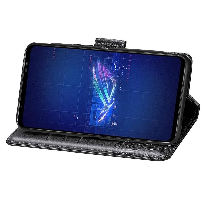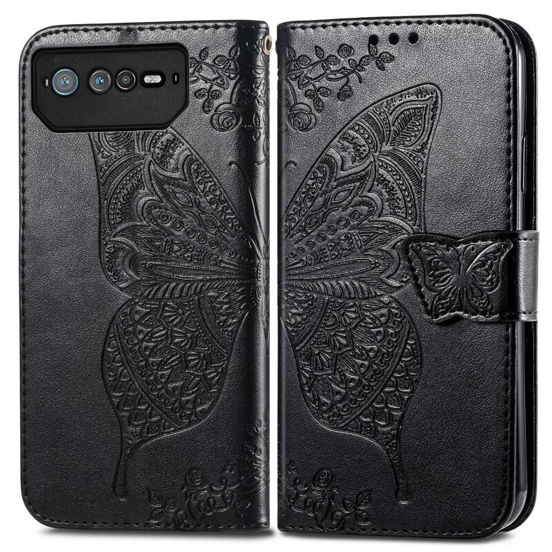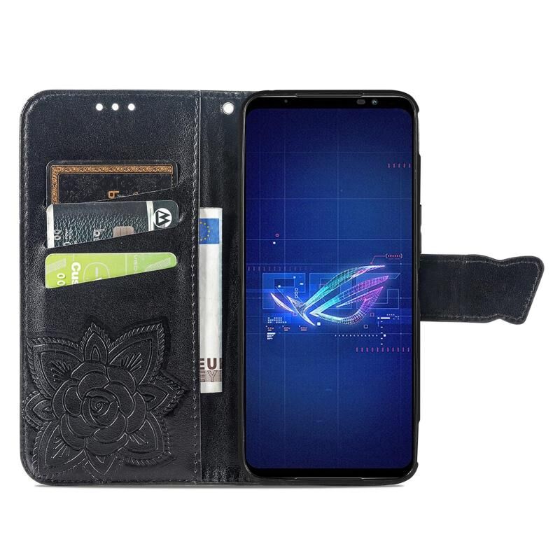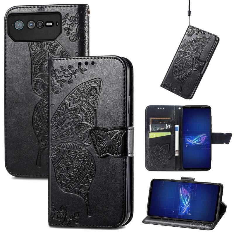 Θήκη τηλεφώνου από δέρμα με ανάγλυφο σχέδιο πεταλούδας και λουλουδιών για Asus ROG Phone 6 (Μαύρο)