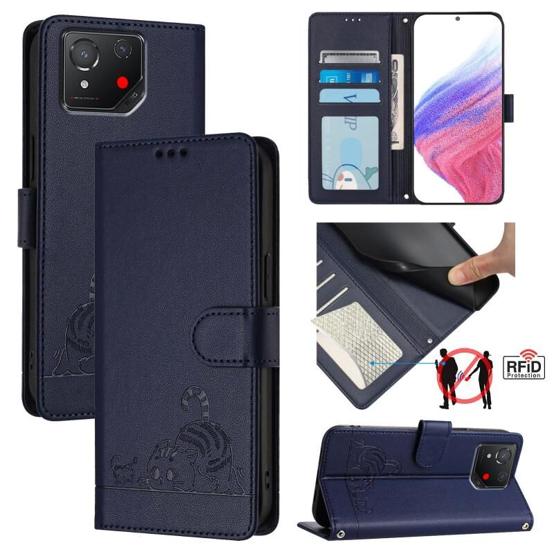 Θήκη τηλεφώνου από δέρμα με ανάγλυφο σχέδιο γάτας και ποντικού για Asus ROG Phone 8 με προστασία RFID και κορδόνι (Μπλε)