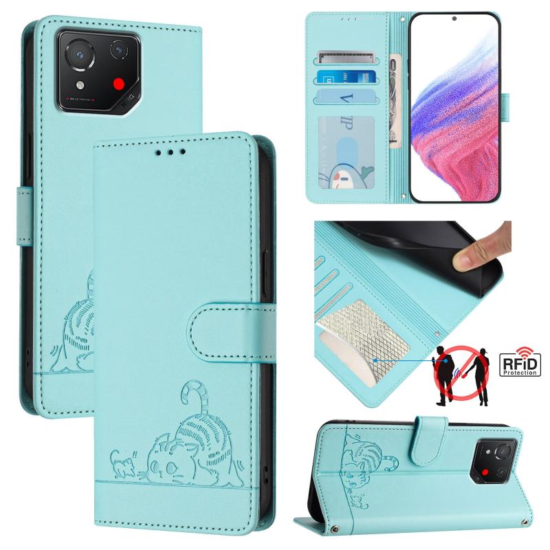 For Asus ROG Phone 8 Cat Rat Embossed Pattern RFID Leather Phone Case with Lanyard(Mint Green)