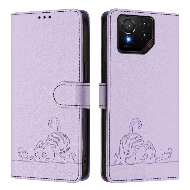 For Asus ROG Phone 9 / 9 Pro Cat Rat Embossed Pattern RFID Leather Phone Case with Lanyard(Purple)