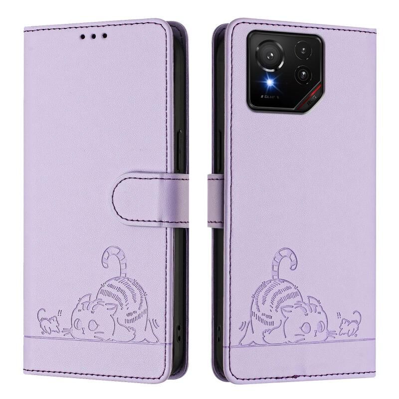 Θήκη τηλεφώνου από δέρμα με ανάγλυφο σχέδιο γάτας και αντι-RFID για Asus ROG Phone 9 / 9 Pro με κορδόνι (Μωβ)