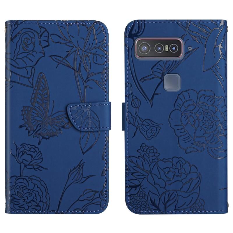 Θήκη τηλεφώνου από δέρμα με ανάγλυφο σχέδιο πεταλούδας και παιώνιας για Asus Smartphone για Snapdragon Insiders (Μπλε)