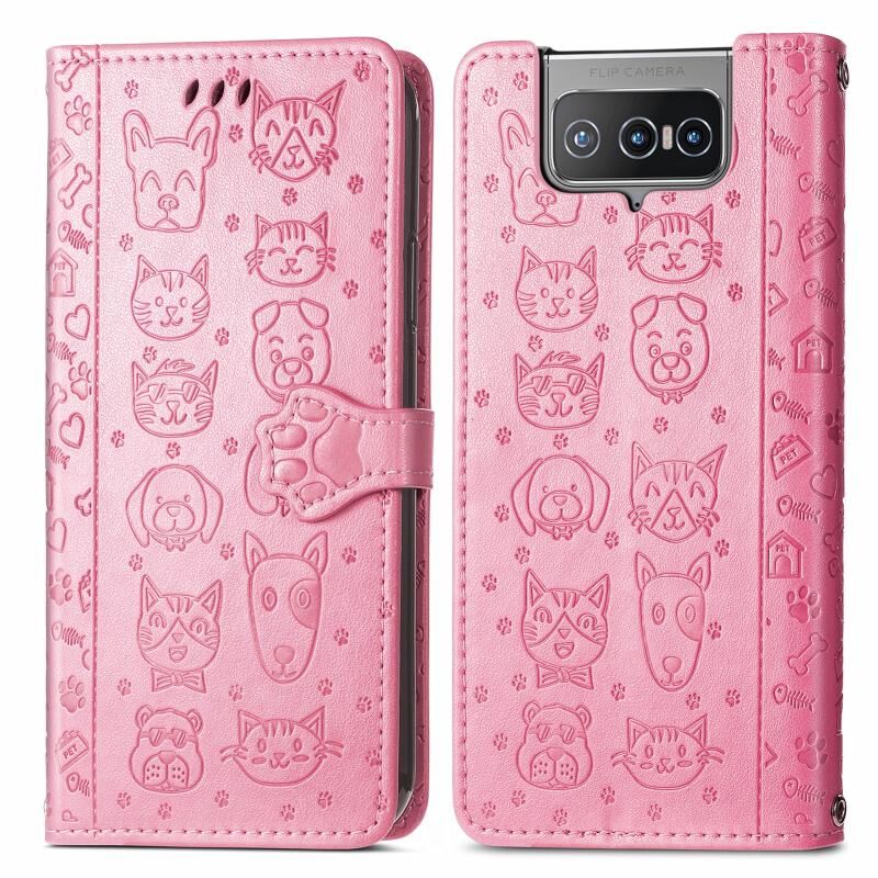 Θήκη δέρματος οριζόντιας αναδίπλωσης για Asus Zenfone 8 Flip με χαριτωμένο σχέδιο ανάγλυφου γάτας και σκύλου, με βάση στήριξης & υποδοχές καρτών & πορτοφόλι & κούμπωμα καρτούν & κορδόνι (Χρυσό).
