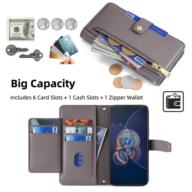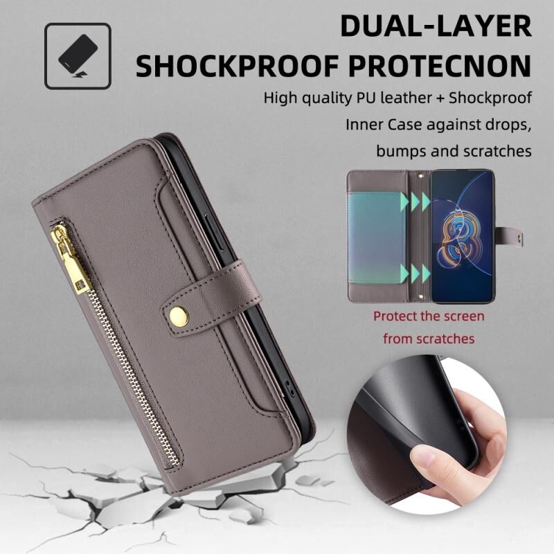 Θήκη τηλεφώνου από δέρμα με υφή προβάτου, με φερμουάρ και λουρί για το ASUS Zenfone 8 Flip / ZS672KS (Μαύρο)