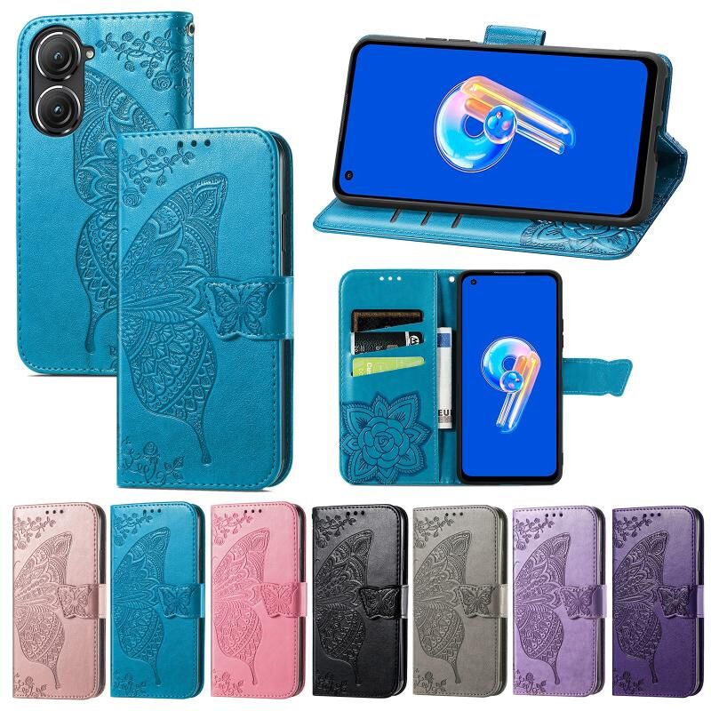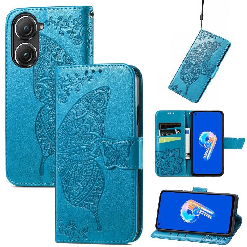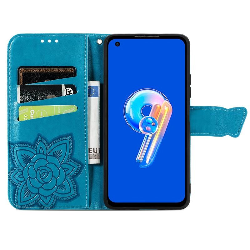 Θήκη τηλεφώνου από δέρμα με ανάγλυφο σχέδιο πεταλούδας και λουλουδιών για Asus Zenfone 9 (Μπλε)