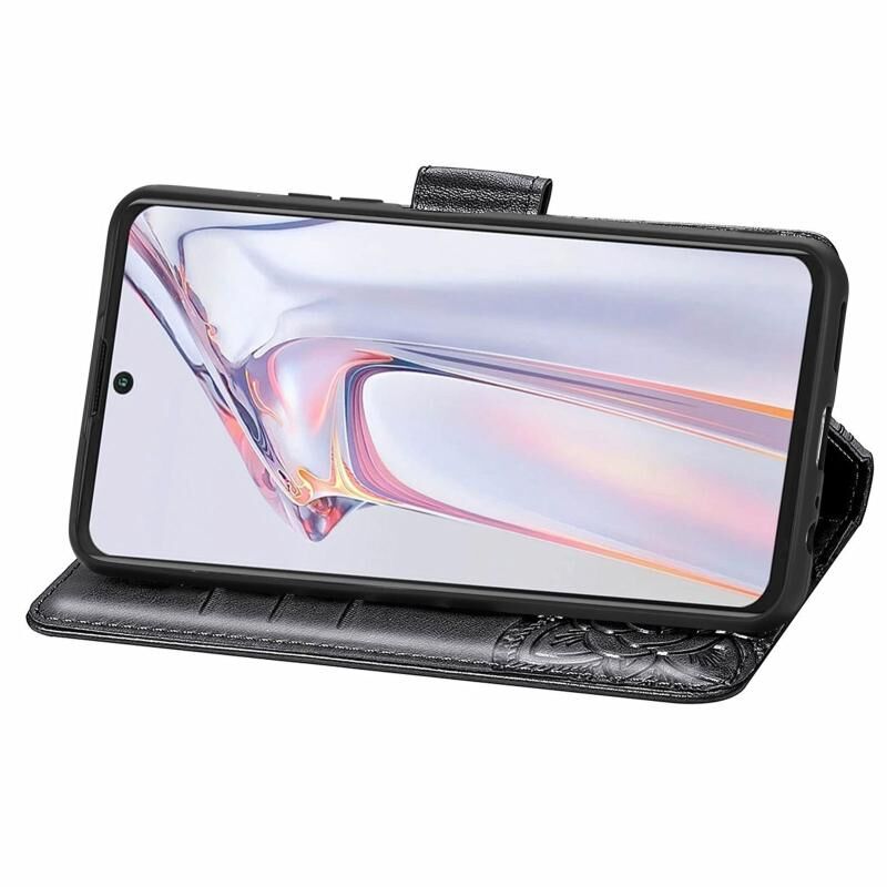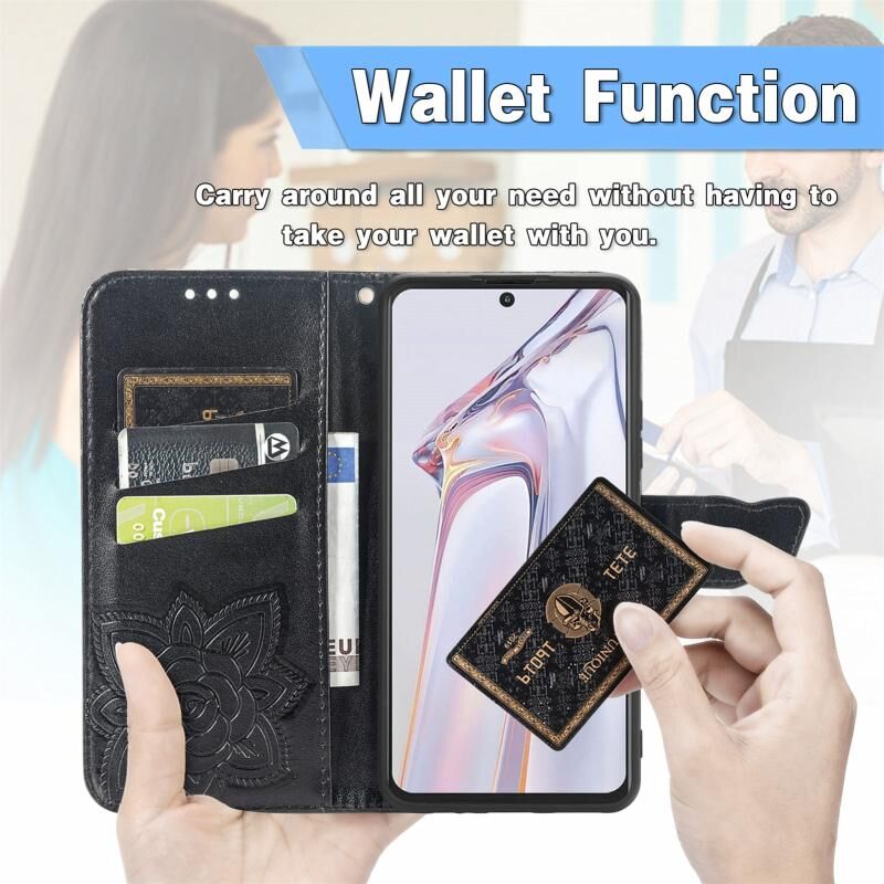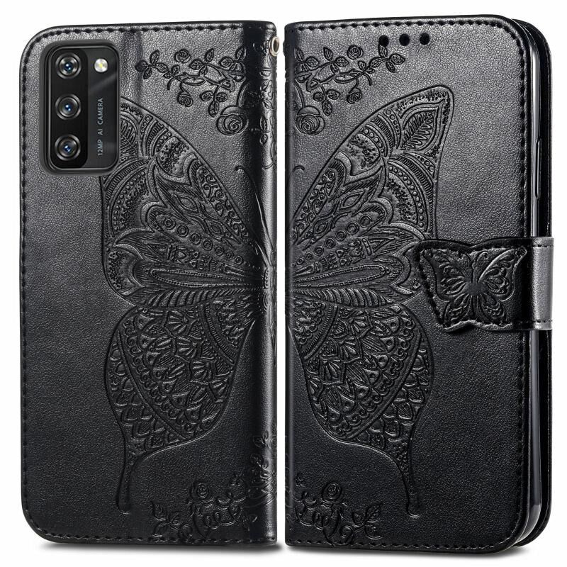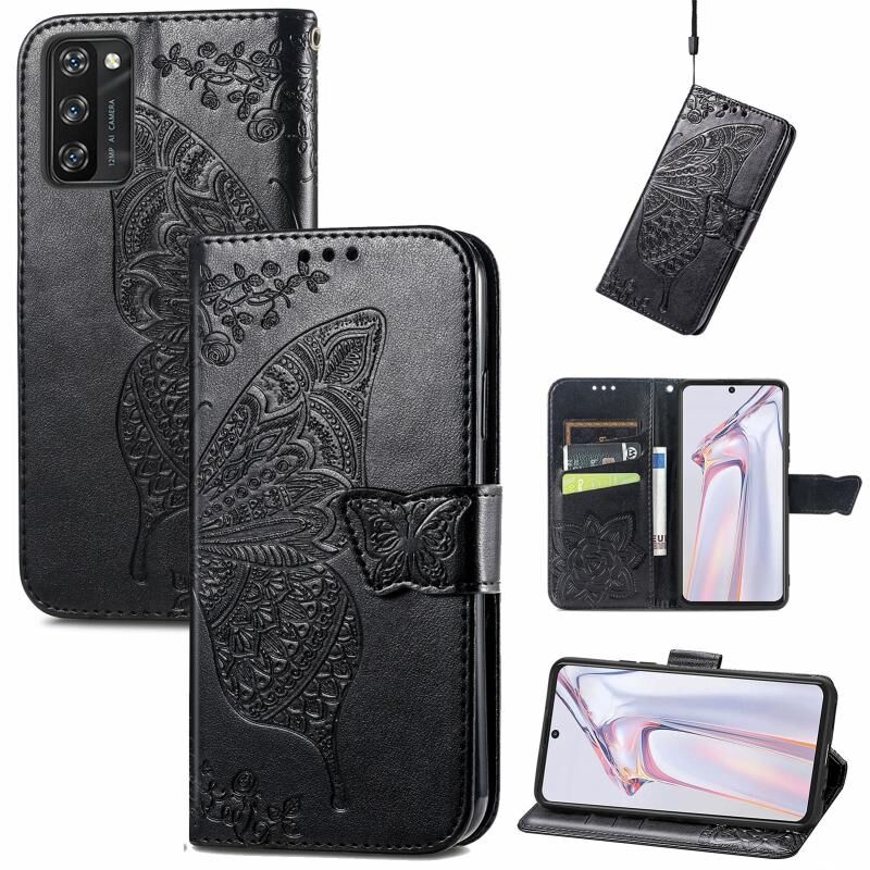 Θήκη Blackview A100 Butterfly Love Flower ανάγλυφη οριζόντια δερμάτινη με βάση & υποδοχές καρτών & πορτοφόλι & λουρί (Μαύρο)