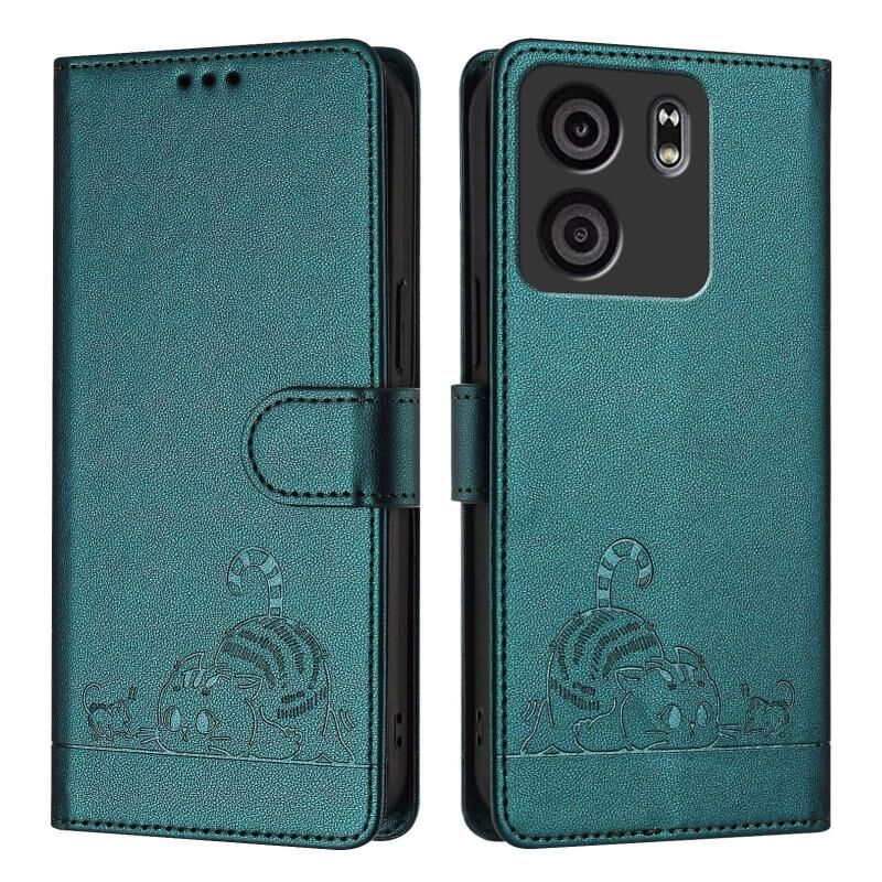 Θήκη τηλεφώνου BLU View 5 με ανάγλυφο σχέδιο γάτας και ποντικιού, από δέρμα με προστασία RFID και λουρί (Μέντας Πράσινο)
