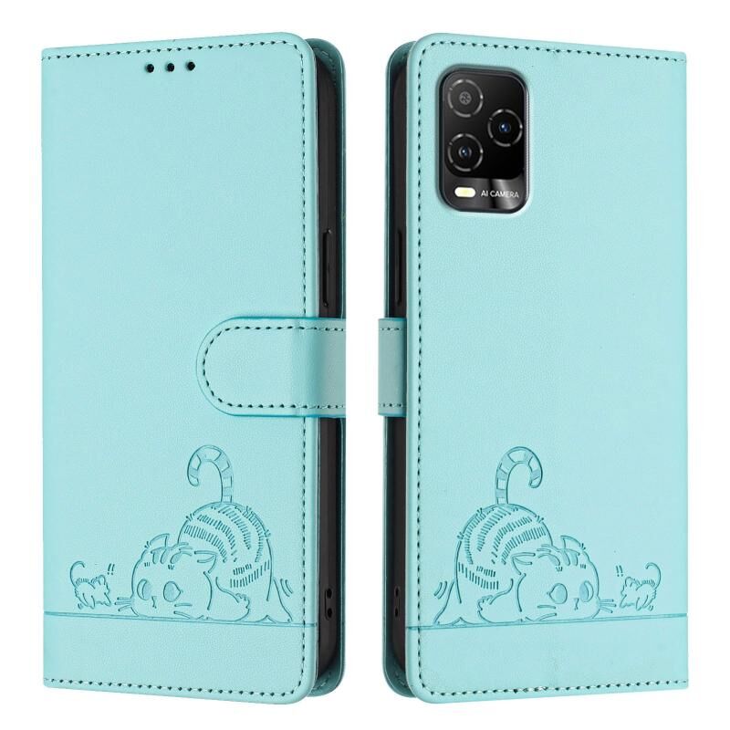 Θήκη τηλεφώνου από δέρμα με ανάγλυφο σχέδιο γάτας και ποντικού για BLU View 5 Pro, με προστασία RFID και λουρί (Μέντας Πράσινο)