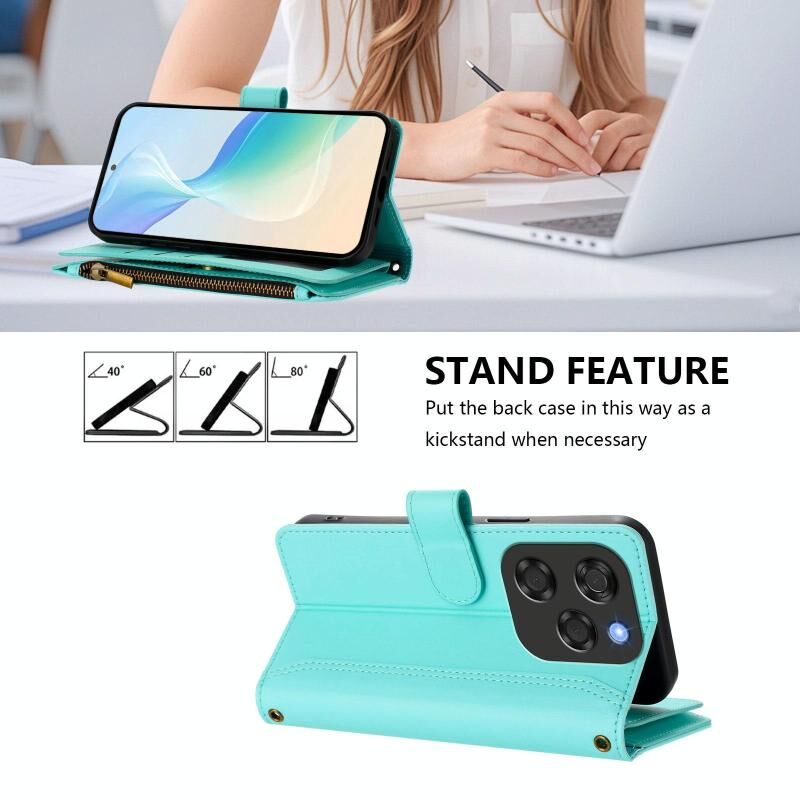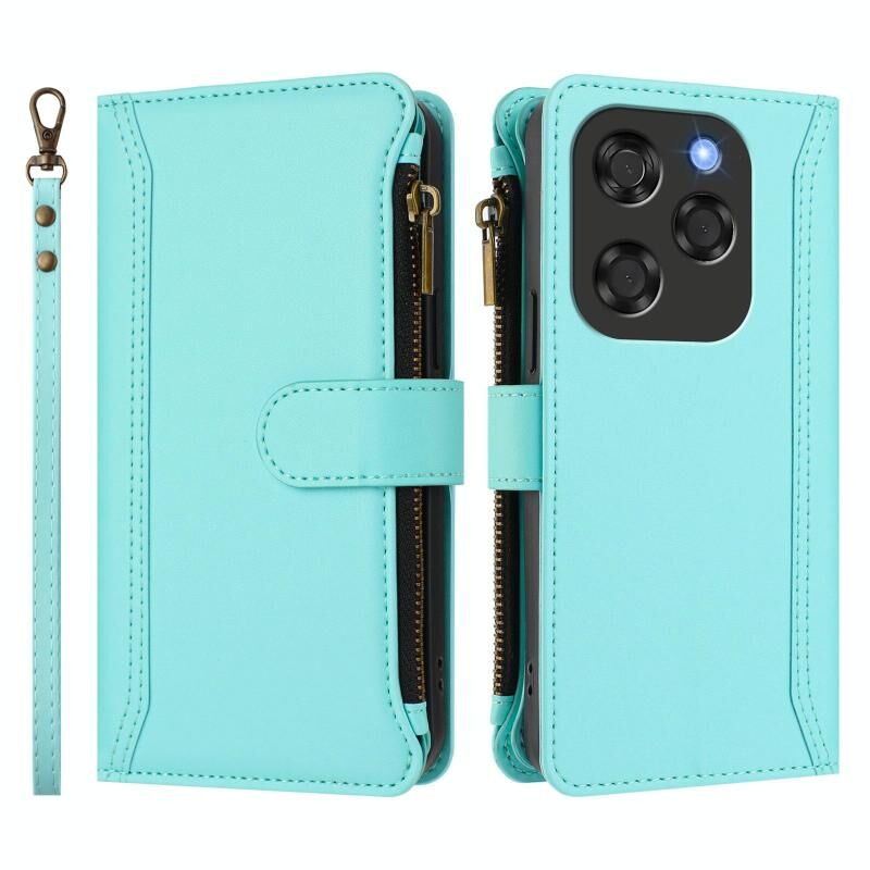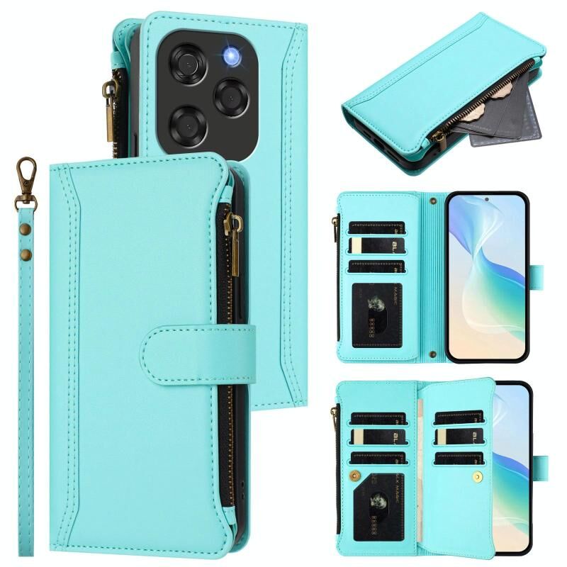For Coolpad X100 Magnetic Closure 9 Card Slots Zipper Leather Case with Hand Strap(Mint Green)