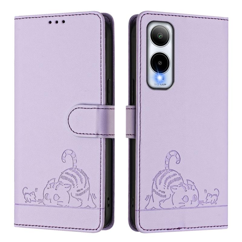 For Cricket Icon 6 Cat Rat Embossed Pattern RFID Leather Phone Case with Lanyard(Purple)