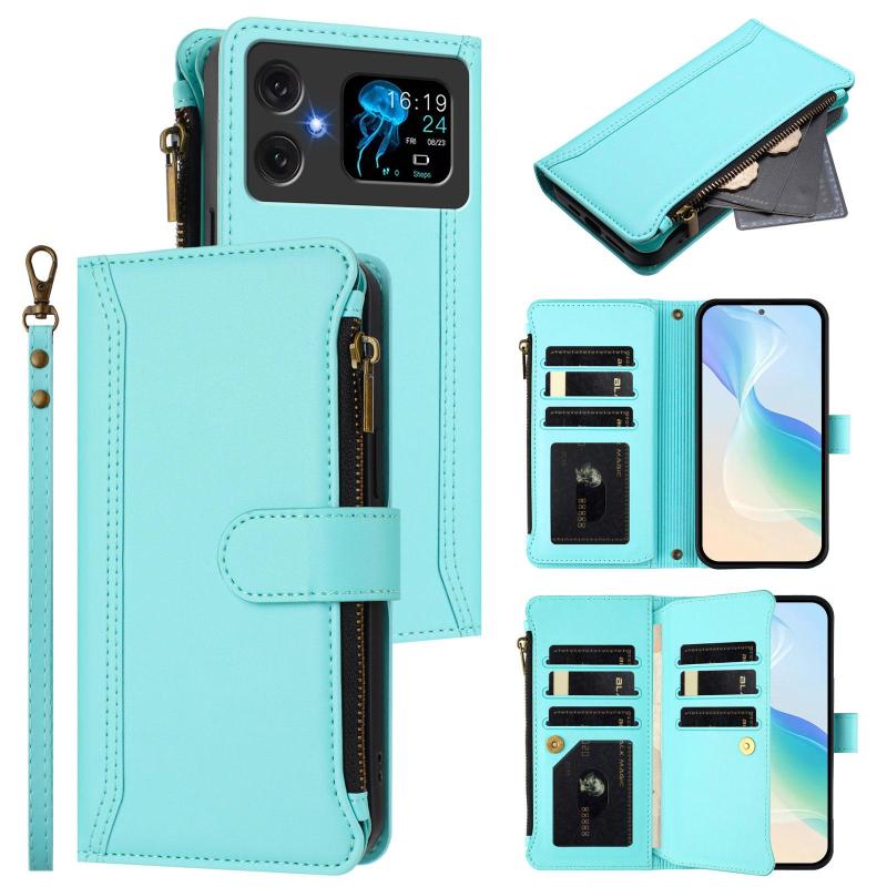 For Cubot A20 Magnetic Closure 9 Card Slots Zipper Leather Case with Hand Strap(Mint Green)