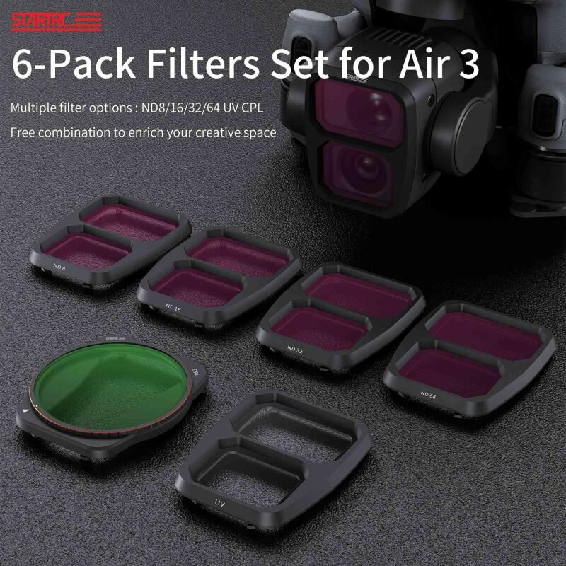 - AIR 3 lenses are protected from all-round damage. At the same time, it reduces the amount of light entering the camera lens of the drone, and helps avoid overexposure, resists scattered light and increases color saturation, making the picture more transparent and gorgeous. ND 8/16/32/64 filters provide 3/4/5/6 levels of light reduction respectively. When using it, the shutter speed can be reduced to make the picture have a proper motion blur. It is often used to shoot waterfalls, flowing water, waves, mountains, rivers and other landscape themes to achieve large effects such as foggy flowing water and night light trails.