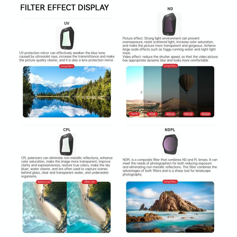 3. ND Filter: You can get more freedom to control aperture and shutter, bring more exposure methods and creative space for photography creation, and effectively prevent overexposure. The number behind ND represents the ability of the ND mirror to block light.
