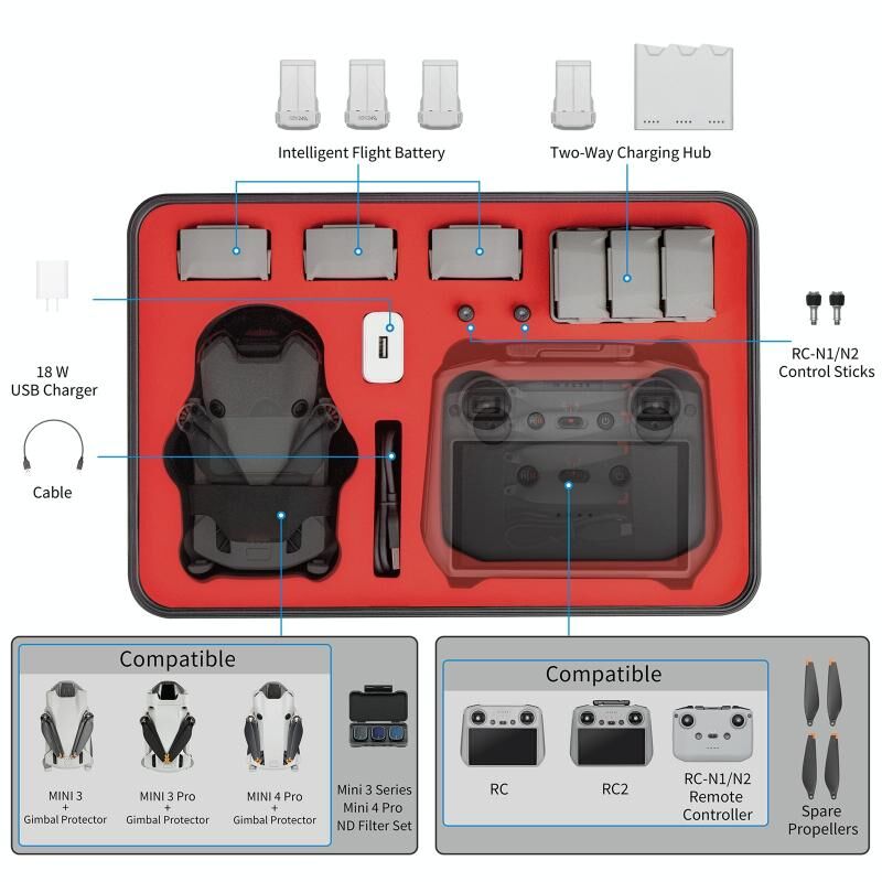 1. Σχεδιασμένο ειδικά για DJI Mini 4 Pro, έχει κομψή εμφάνιση, μικρό μέγεθος αλλά μεγάλη χωρητικότητα. Μπορεί επίσης να αποθηκεύσει το αεροσκάφος και ένα πλήρες σετ αξεσουάρ (μπορούν να χρησιμοποιηθούν και τα δύο τηλεχειριστήρια).