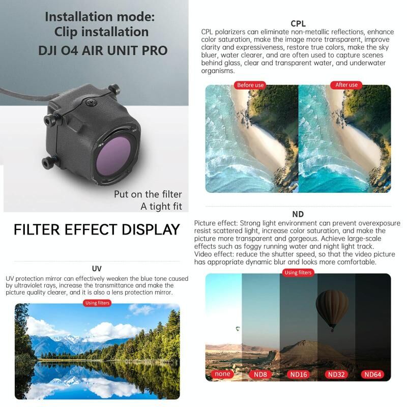 1. UV φίλτρο: Κατάλληλο για λήψεις στη θάλασσα, στα βουνά, στα χιονισμένα πεδία και σε ανοιχτές περιοχές κ.λπ. Μπορεί να μειώσει τον μπλε τόνο που προκαλείται από τις υπεριώδεις ακτίνες. Ταυτόχρονα, για την κάμερα, μπορεί επίσης να εξαλείψει την παρεμβολή των υπεριωδών ακτίνων στο CCD, το οποίο βοηθά στη βελτίωση της ευκρίνειας και της χρωματικής απόδοσης.