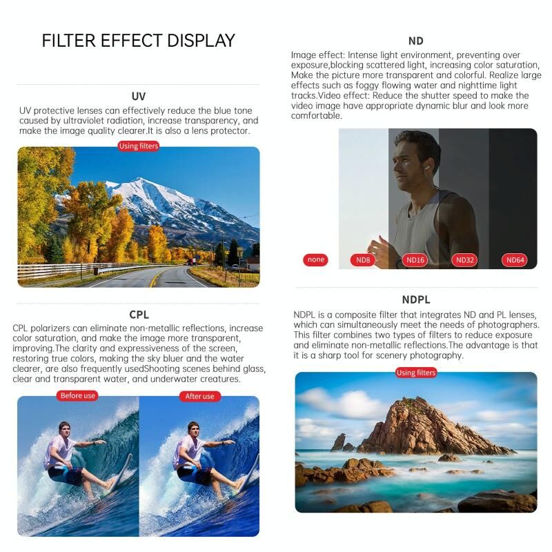 2. Φίλτρα CPL: Αυξάνει τον κορεσμό των χρωμάτων, δημιουργώντας βαθιές, πλούσιες γραφικές εικόνες. Βοηθά στη μείωση της ποσότητας του φωτός που εισέρχεται στο φακό.