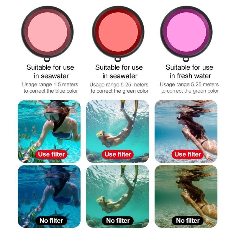 - Purple filter: Purple filter: The purple filter is color-corrected when shooting in green sea water with a depth of 5 to 25 meters. It is ideal for in freshwater lakes, fresh reservoirs or in salt water where because of green algae to take pictures.