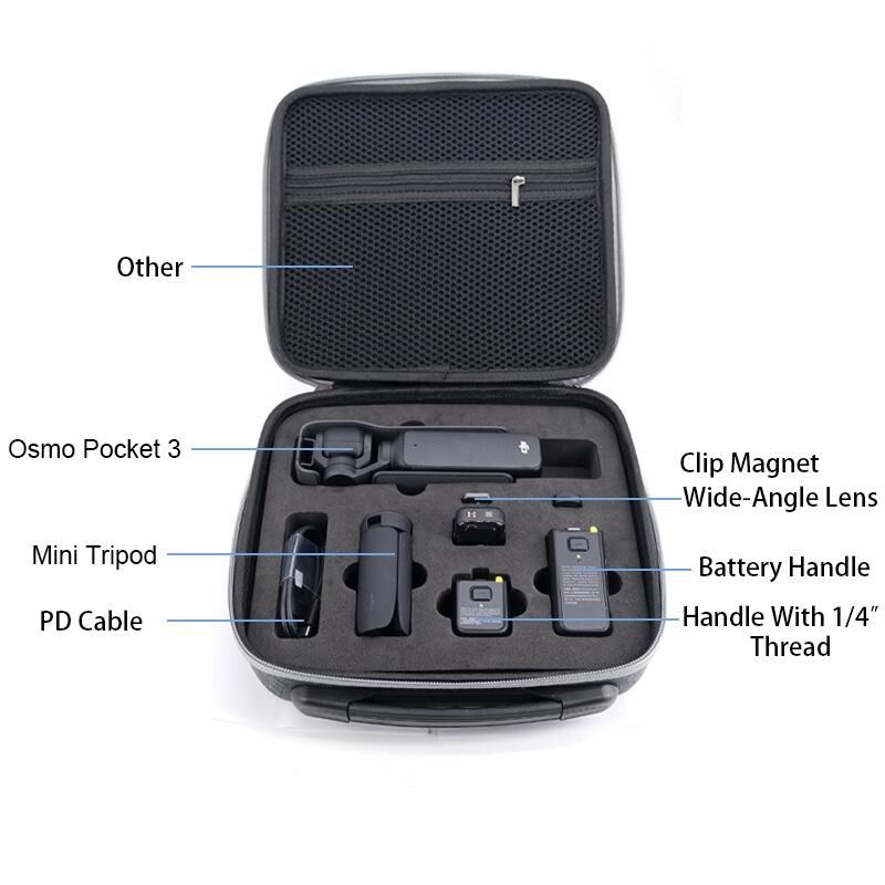 1. Ένα κουτί αποθήκευσης ειδικά σχεδιασμένο για την κάμερα δράσης DJI Pocket 3 και ένα πλήρες σετ αξεσουάρ. Είναι εξαιρετικά αδιάβροχο, ανθεκτικό στην πίεση και ανθεκτικό στη φθορά.