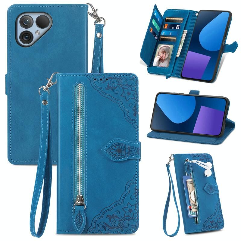 Για Fairphone 5 ανάγλυφο λουλούδι φερμουάρ δερμάτινη θήκη τηλεφώνου (μπλε)