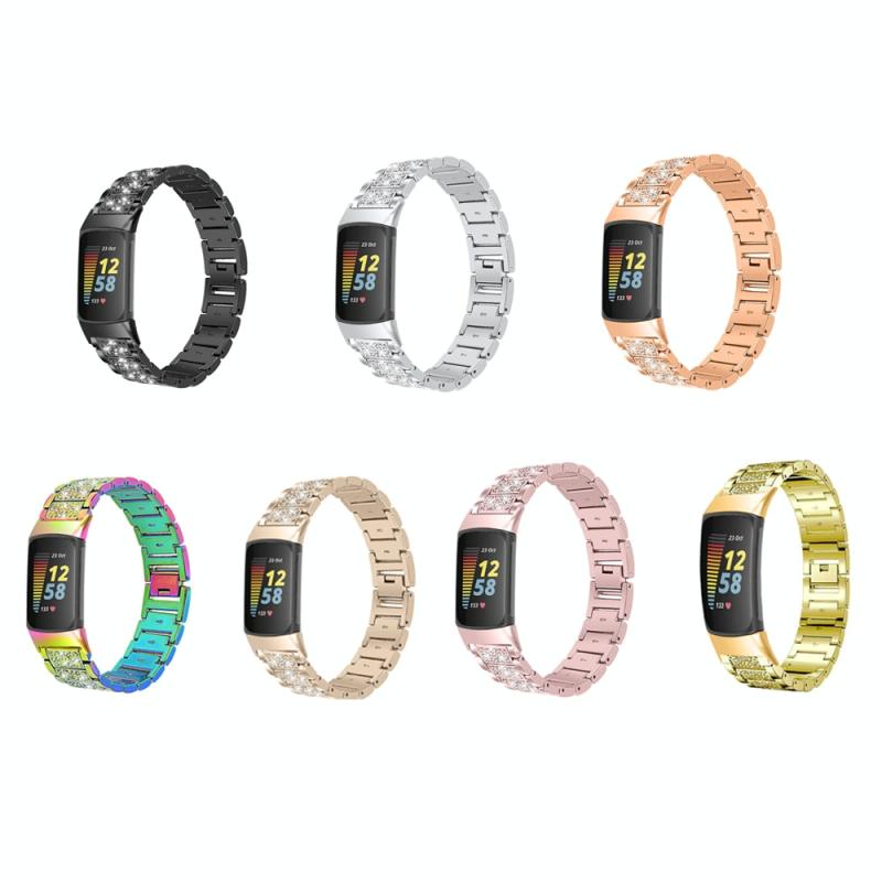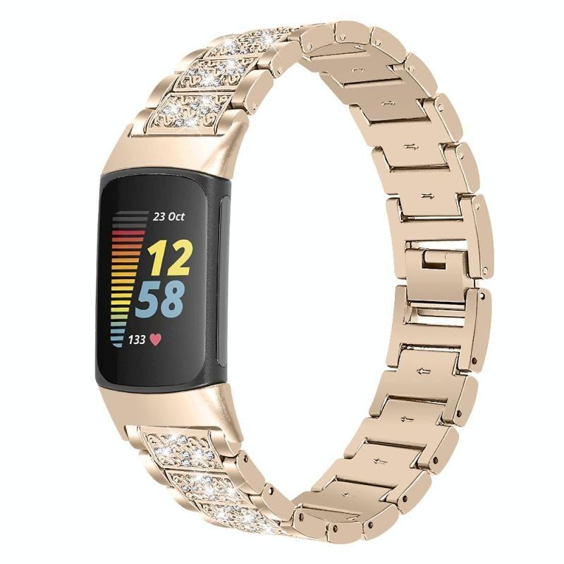 For Fitbit Charge 5 Diamond Stainless Steel Watch Band(Retro Gold)
