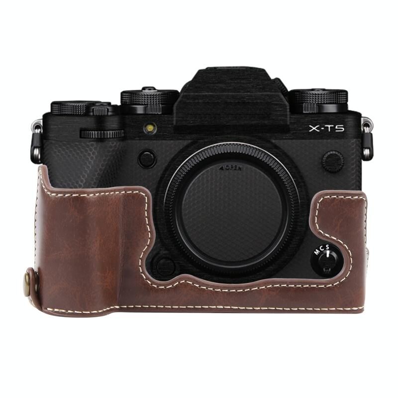 Για FUJIFILM X-T5 Γυαλιστερό PU δέρμα φωτογραφικής μηχανής Μισή βάση θήκης (Καφές)