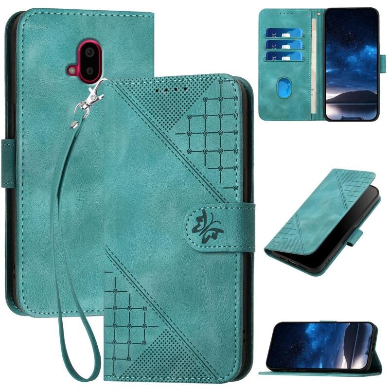 For Fujitsu Arrows F-52B Grid Butterfly Embossed Pattern Flip Leather Phone Case with Lanyard(Light Blue)