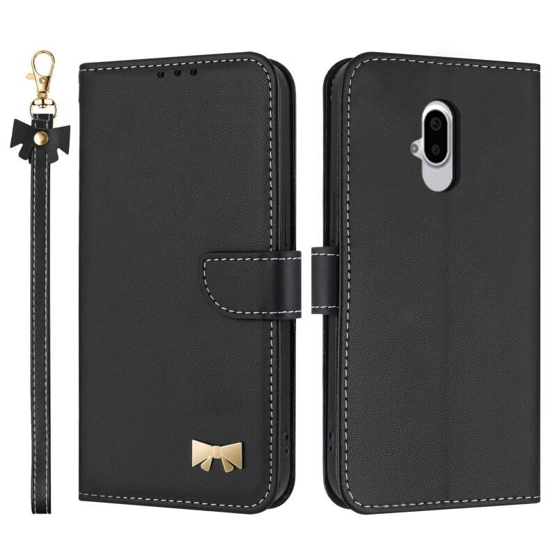 For Fujitsu Arrows F-52B Metal Bow Leather Phone Case with Hand Strap(Black)