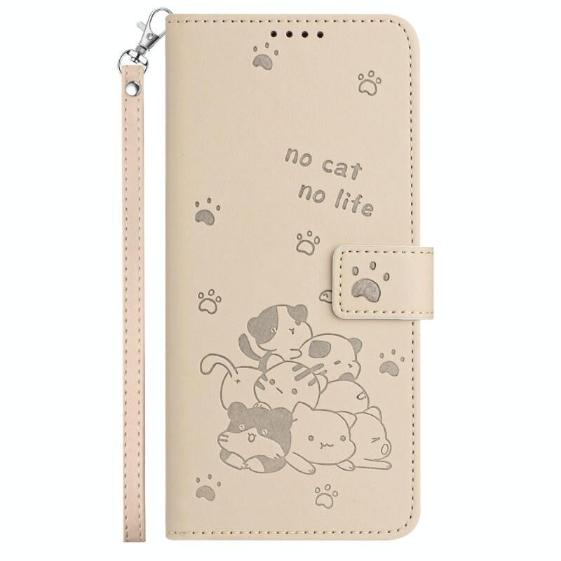 Θήκη τηλεφώνου δερμάτινη με ανάγλυφο γατάκι και λουρί για Fujitsu Arrows We2 F-52E (Μπεζ)