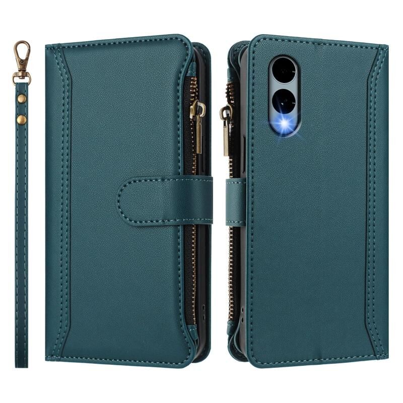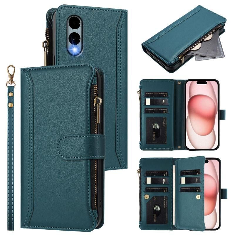 For Fujitsu Arrows We2 Magnetic Closure 9 Card Slots Zipper Leather Case with Hand Strap(Dark Green)