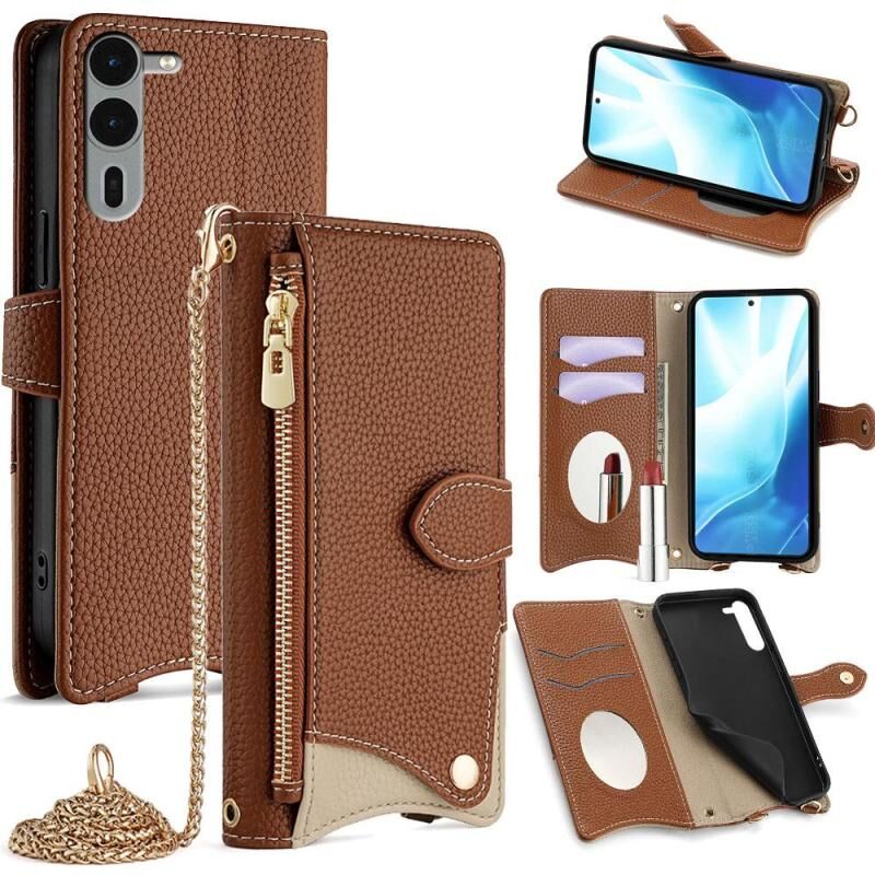 Θήκη κινητού τηλεφώνου Fujitsu Arrows We2 Plus F-51E, δερμάτινη με υφή λυτσί, σε χρώμα καφέ, με αλυσίδα και σχέδιο ψαροουράς.