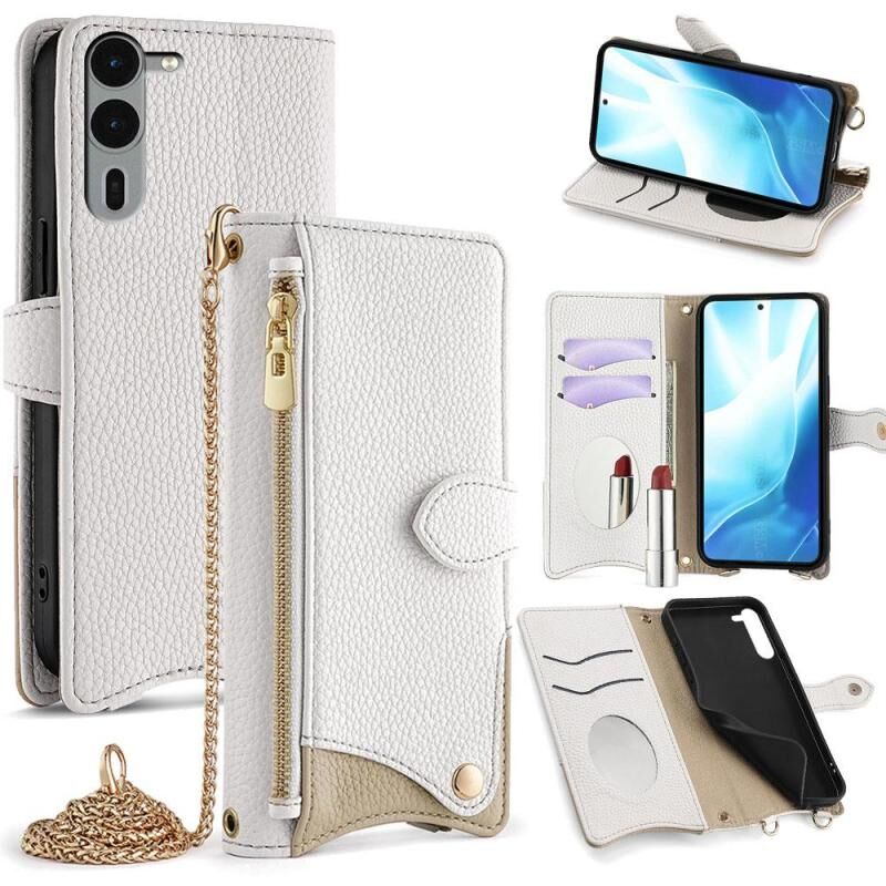 Θήκη κινητού τηλεφώνου Fujitsu Arrows We2 Plus F-51E, δερμάτινη με υφή λυτσί, σε χρώμα καφέ, με αλυσίδα και σχέδιο ψαροουράς. (Λευκό)
